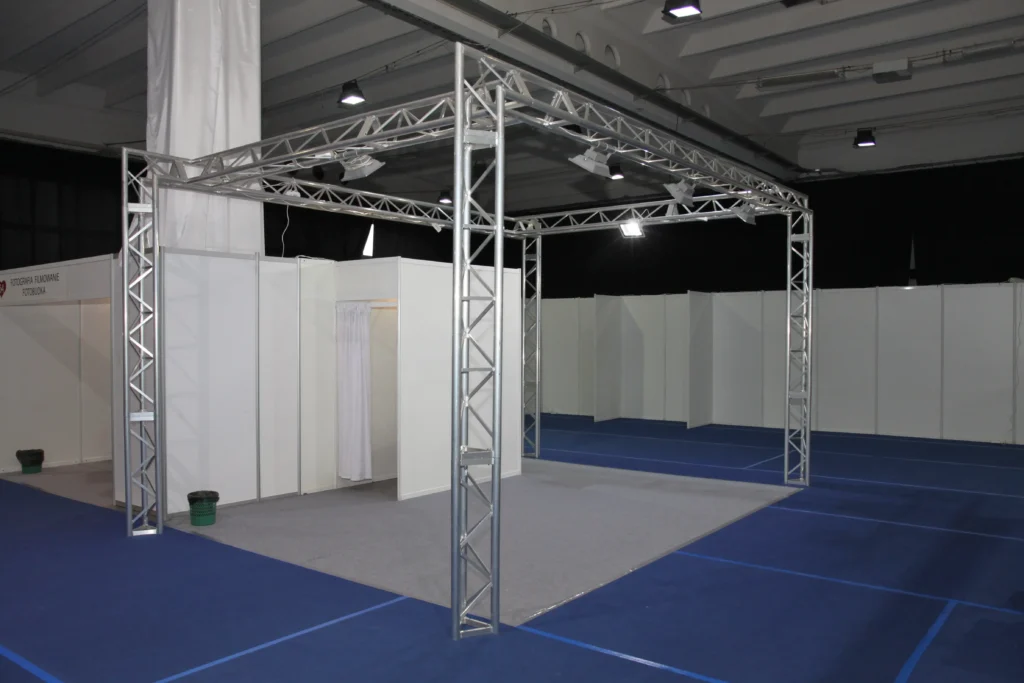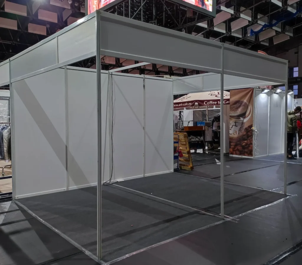 Stoiska budowane są w systemie Octanorm, którego wymiary ilustruje poniższa grafika, pokazująca przykładowe stoisko 2 x 2 m. Większe stoiska są budowane z takich samych ustandaryzowanych modułów, łatwo więc przeliczyć szerokość i długość po ilości ścianek. Ścianki wypełniające profile to płyta MDF w kolorze białym.