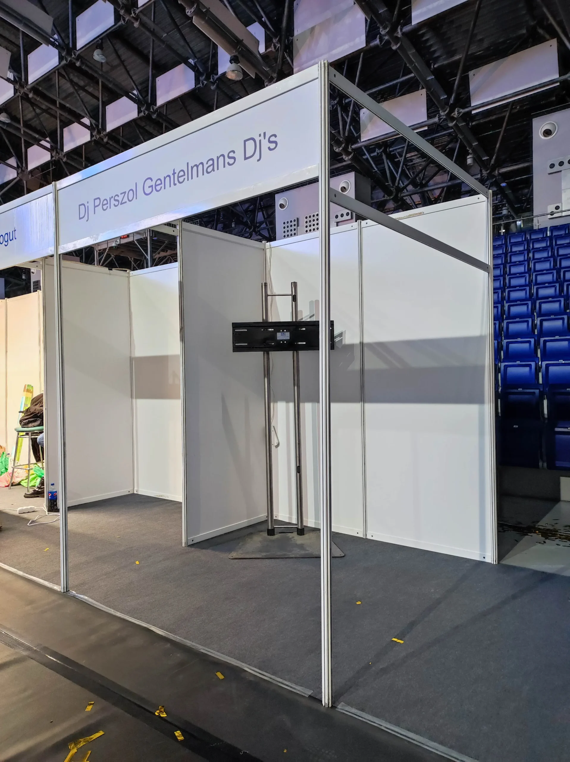 Na podłodzie znajduje się wykładzina w kolorze szarym, która na życzenie wystawcy za dopłatą może zostać zamieniona innym kolorem.